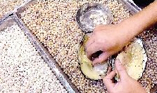 作为北方人,你见过直接从河蚌中取珍珠吗?昨日上午,郑州国际会展中心一楼展馆的一个展位上方,广告语这样写道:“现杀现卖,珍珠一颗5元,假一赔万。”这个展位的地上摆放了一大堆打开的河蚌,每个河蚌里露出七八个人工养殖而成的珍珠。“珍珠5元一颗,可以免费打眼,做成手链或者项链,也可以现场打磨成珍珠粉。”工作人员招揽着生意。