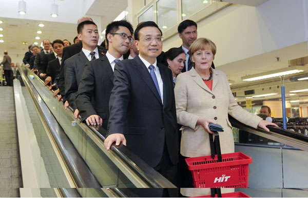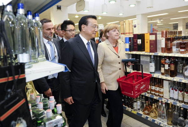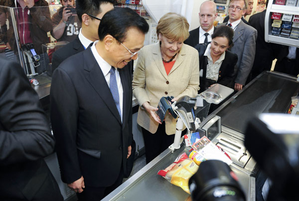 当地时间10月10日下午,中德总理结束政府磋商后,李克强、默克尔临时光顾了柏林一家超市。默克尔饶有兴致地向李克强介绍超市里的产品,还向他推荐了一款可以寄给家人的明信片,并做为礼物送给李克强。两位总理的到来吸引了众多顾客驻足,纷纷上前与中德总理握手问候。中新社发 刘震 摄