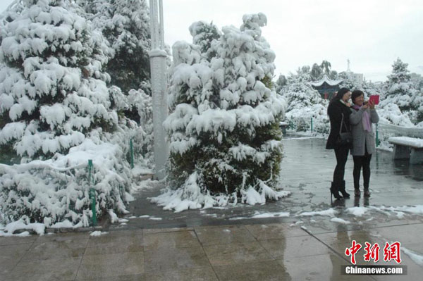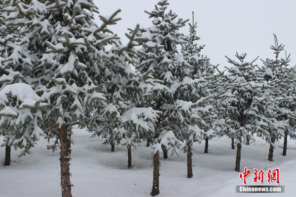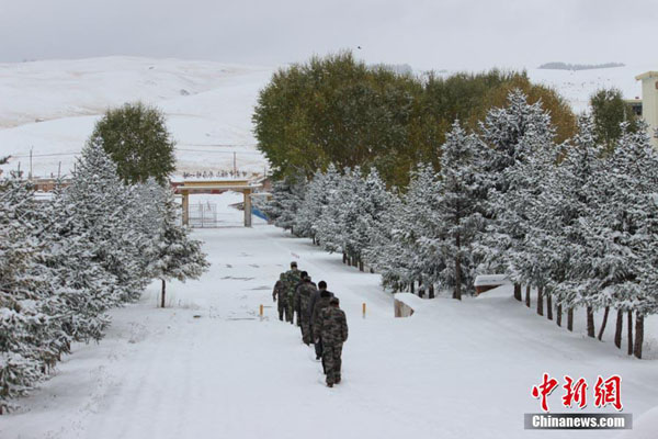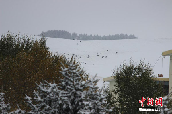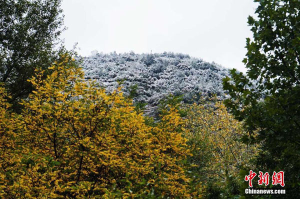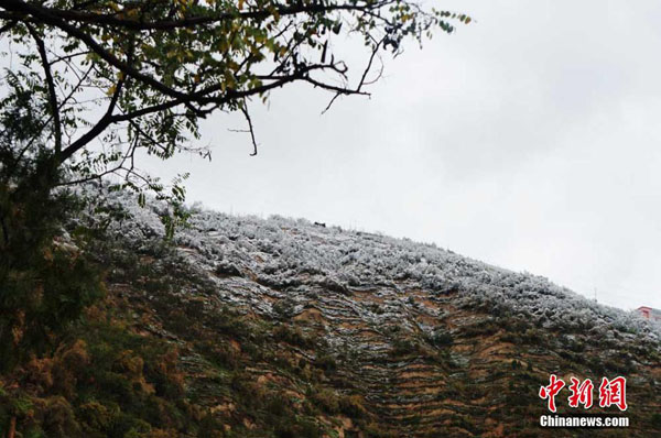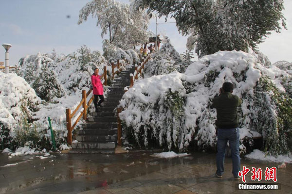 10月11日,兰州飘雪,夏日绿色、秋日黄色、冬日雪白色汇聚起来,让沉浸于“童话世界”的兰州年轻人直呼惊喜。来自气象部门的消息称,甘肃张掖、金昌、武威、兰州、甘南、临夏、天水等地连日来出现降雪。 杨艳敏 摄