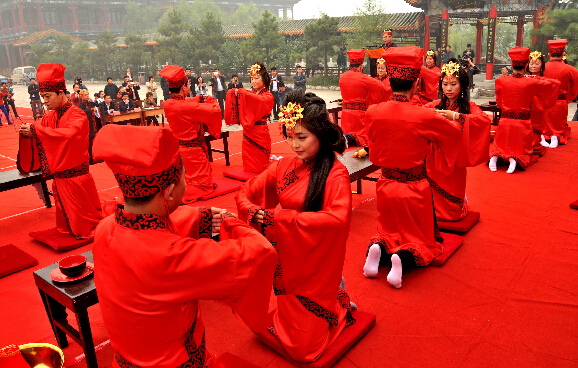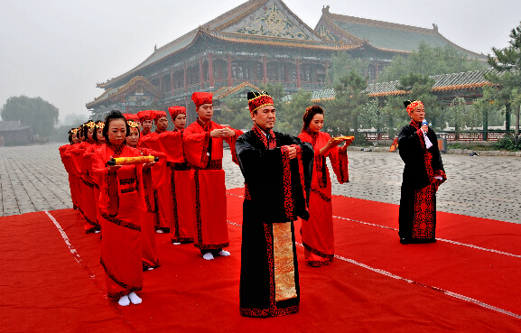 当日,河北省临城县文明办、共青团临城县委在临城县岐山湖联合举办首届汉式集体婚礼。8对新人身着汉式婚礼服装,通过汉式婚典仪式喜结连理。