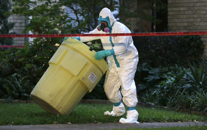 10月12日,在美国达拉斯,一名身穿防护服的危险品紧急处理小组工作人员为第二例埃博拉感染病例的住所消毒。