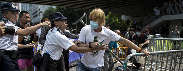 另外,數十名戴口罩人士,於昨午約1時半亦在反「占中」游行期間聚集在力寶中心對開。他們趁警方援兵未到,迅速用剪刀剪斷綁住鐵馬的膠條并移走鐵馬,期間與占領的學生發生推撞,場面混亂。有示威者見情况危急,竟將自己鎖在鐵馬上,被一群戴口罩人士連人帶鐵馬抬走,最后由增援的警員救出。亦有一批反占領市民成功在干諾道中拆除示威者搭建的帳篷及營幕。