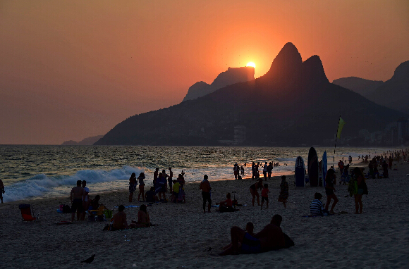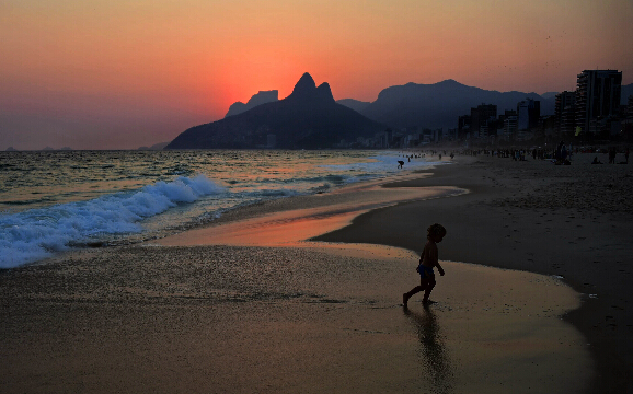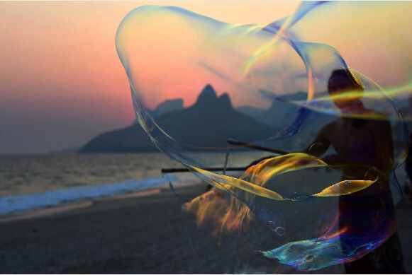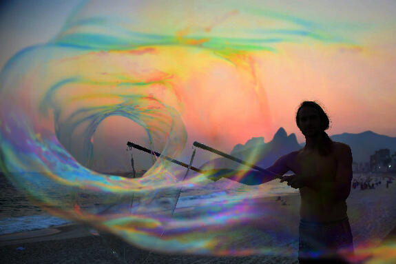 10月13日,日落时分,一名游客在巴西里约热内卢的伊帕内马海滩上制造泡泡。