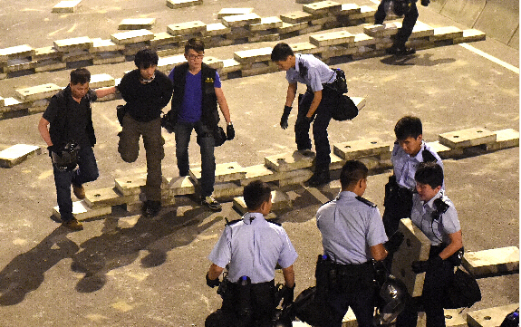 10月15日凌晨,香港警方对特首办门外及龙和道清场,将部分阻挠清道的非法集会者逮捕。中新社发张宇摄