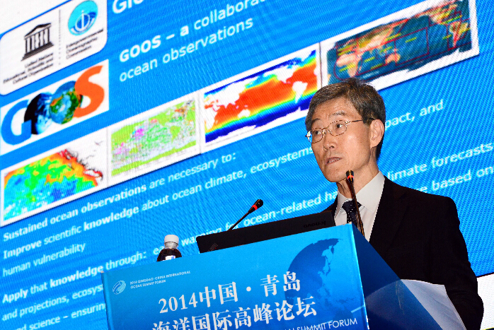 10月15日,联合国教科文组织政府间海洋学委员会主席卞相庆在2014中国·青岛海洋国际高峰论坛上做主旨演讲