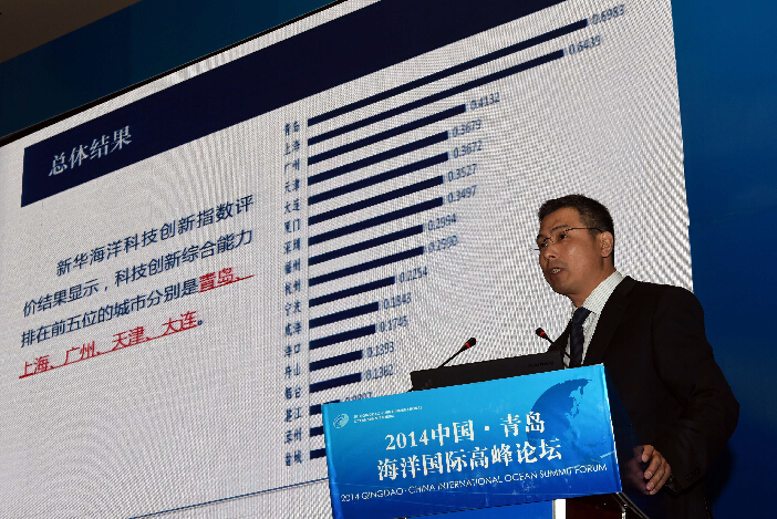 国家金融信息中心指数研究院执行副院长周文龙在2014中国·青岛海洋国际高峰论坛上发布新华海洋科技创新指数
