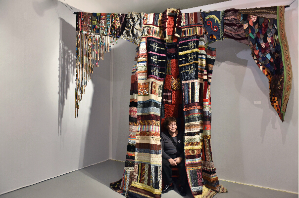 在法国巴黎,艺术家约克特·西伯在其丝绒材质拼贴作品前坐着让摄影师拍照