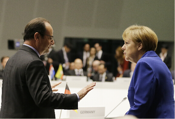 法国总统奥朗德(左)同德国总理默克尔在意大利米兰会议中心交谈