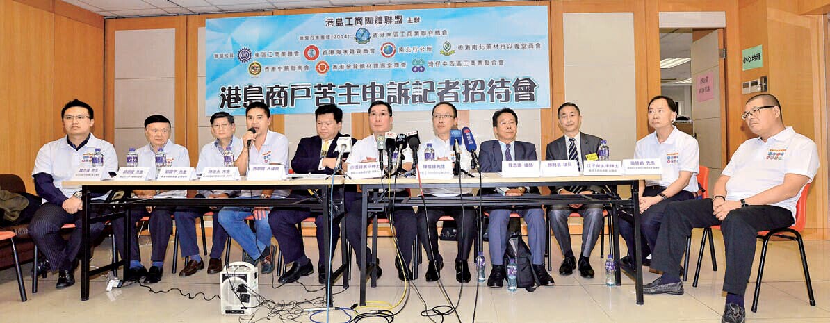 由香港南區工商業聯合總會、東區工商業總會、香港中藥聯商會、香港南北藥材行以義堂商會、香港海味雜貨商會、香港參茸藥材寶壽堂商會、南北行公所及灣仔中西區工商業聯合會八個團體組成的「港島工商團體聯盟」,昨日舉行港島商戶苦主申訴會。聯盟召集人廖漢輝稱,「佔領」行動至今已20天,已對香港造成巨大損失,包括香港國際聲譽、香港工商界,甚至全港市民。他說,有部分商舖需要停業二至三天,生意額下跌二至五成。有飲食集團反映,「佔中」令他們每天損失約200萬元營業額,至目前為止約損失4000萬元;亦有金飾連鎖店指,自由行人數因事件減少,曾停業三天,估計最少損失6000萬元。