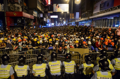 大批站在彌敦道近亞皆老街口的前排示威者,部分人士戴有頭盔及口罩,由於前日日間早已有人號召重奪十字路口,故警方早有準備。甫踏入昨日凌晨零時一刻,突然有人群起拉扯警方架設的鐵馬陣,現場指揮官一聲令下,前線警員立即戴上頭盔,「令旗手」亦迅速打開紅旗警告,軍裝及便裝警員均拔出伸縮警棍、或設有護手的粗身警棍,向示威者步步進迫,揮動警棍喝止示威者前進。