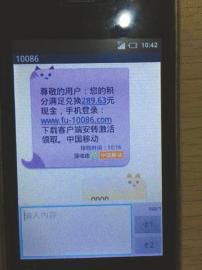 记者在小王的手机上看见,这条短信确是以10086的名义发来的,内容为:“尊敬的客户,你的积分满足兑换289.63元现金,手机登录www. fu-10086.com下载客户端安装激活领取。”落款为:中国移动。随后,记者登录了短信上的网址,不过,电脑上的安全软件却提醒这是假冒中国移动通信的网站。