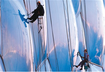 10月15日,在北京国家游泳中心,清洁工人们借助保险绳攀上水立方膜结构外立面进行清洗作业。张宇摄(新华社发)
