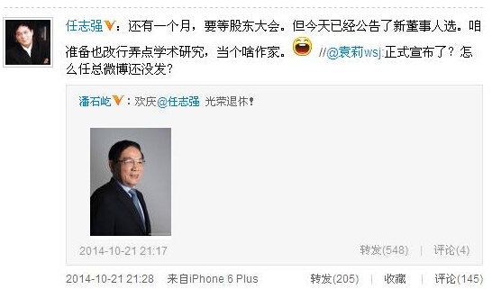 凤凰财经综合 任志强今日微博表示即将退休,“还有一个月,要等股东大会。但今天已经公告了新董事人选。咱准备也改行弄点学术研究,当个啥作家。”