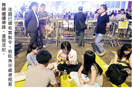 【香港商报讯】记者冯仁乐报道:尽管高等法院已於前日发出临时禁制令,禁止占据旺角马路及金钟中信大厦出入口,但示威人士「依然故我」,警察公共关系科总警司许镇德昨日呼吁,示威人士尊重法治及法庭命令,停止非法霸占路面。另外,5名行会成员早上出席行政会议时,主动与警员握手,感谢他们尽忠职守。