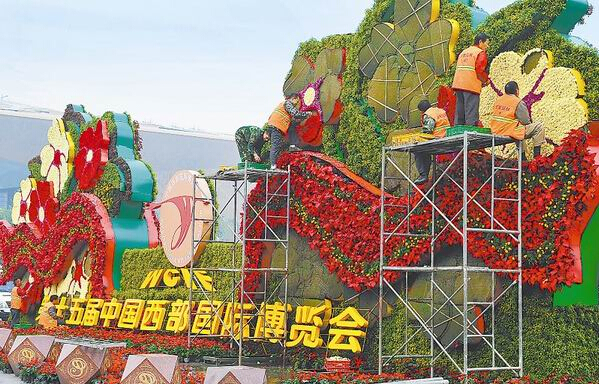 10月20日,园林工人在成都天府广场搭建西博会主题花坛,为即将开幕的第十五届西博会营造出浓烈的喜庆氛围