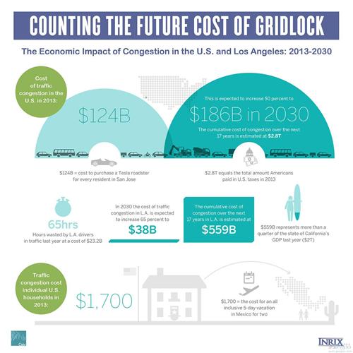 经济和商业研究中心(Centre for Economics and Business Research)和实时汽车交通数据公司Inrix前不久联合发布报告,指出美国因为交通堵塞将遭遇巨额经济损失,原因包括空转燃烧汽油,以及耽搁商机造成的损失等。