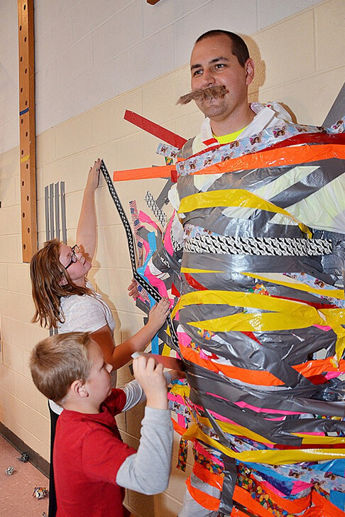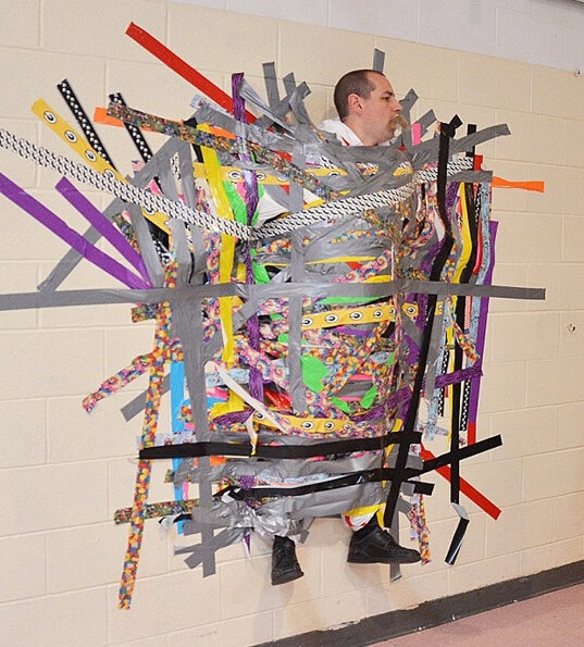 据报道,美国科罗拉多小学校长瑞安?卡斯特向学生们承诺,如果他们能为小镇秋天的狂欢节卖出1万张票,他就答应让学生们把他粘在墙上。