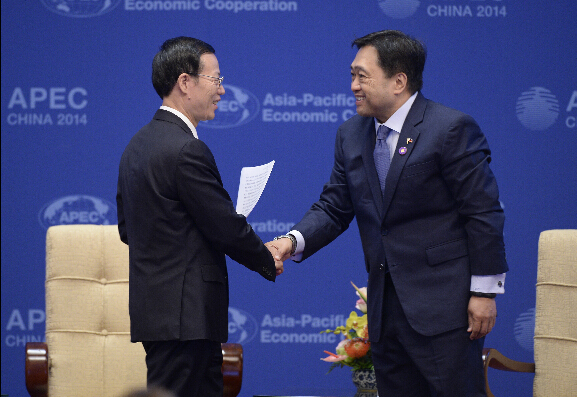 中国国务院副总理张高丽(左)与菲律宾财政部长塞萨尔·普里斯玛 (Cesar Purisima)在席间握手致意