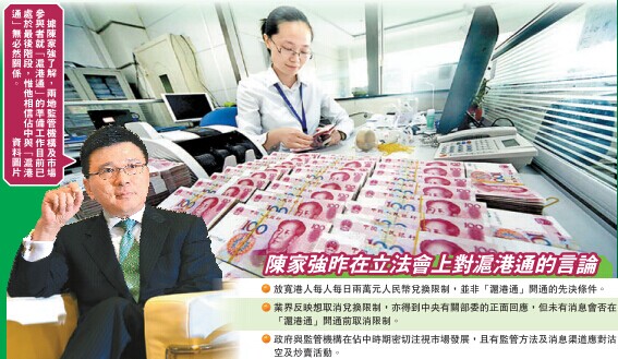 陳家強昨日在立法會上指,業界反映想取消兌換限制,亦獲得中央有關部委的正面回應,但他強調,未有消息會否在「滬港通」開通前取消限制。另外,有議員關注,擔心有人借佔中事件炒作本港金融市場,陳家強回應指,港府與監管機構在這段時期亦有密切注視市場發展,有監管方法及消息渠道應對沽空及炒賣活動。他相信,若有操控或擾亂市場行為出現,監管機構會採取適當行動。