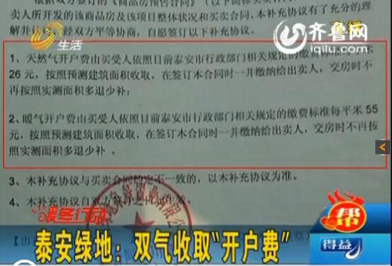 山东广播电视台生活频道《生活帮》记者了解到,业主当时签订购房合同的时候,又签了一个补充协议,注明天然气和暖气开户费,由这些购房者们依照泰安市行政部门规定的缴费标准缴纳。