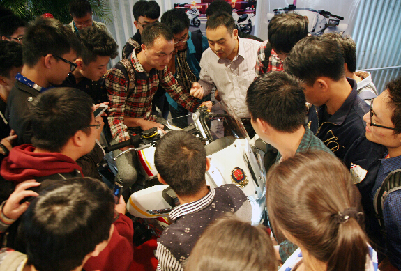 10月23日,记者探访位于浙江省杭州市余杭区的摩托车研发生产厂家,近距离接触国宾护卫摩托车。10月21日,坦桑尼亚总统基奎特抵达北京,开始对中国进行国事访问。从首都机场前往钓鱼台国宾馆的国宾车队中,出现了摩托车护卫队。这些新款国宾摩托车是杭州余杭自主研发完成的国产摩托,是国内第一款装ABS防抱死制动系统和全车LED灯的摩托,最高车速170公里/小时,可以紧急停车并完成180°的转弯。摩托车拥有650CC排量,在零下20℃低温环境下能一次性发动。最特别的是,车身设计上融入了许多中国元素,比如灵感来源于天安门的石狮像,流线型的长城图案等。图为厂家展厅内的国宾护卫摩托车吸引参观者。