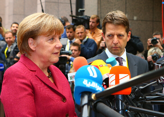 德国总理默克尔抵达欧盟秋季峰会会场时接受采访