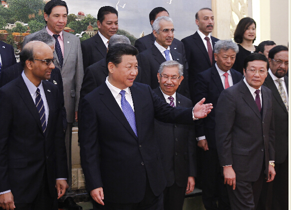中新社北京10月24日电 (记者 张朔)中国国家主席习近平24日上午在北京人民大会堂会见出席筹建亚洲基础设施投资银行备忘录签署仪式的各国代表。