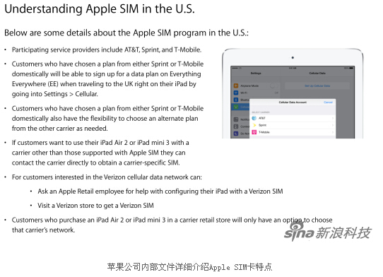 新浪手機訊 10月27日上午消息,在10月的新iPad發布會之後,蘋果公司悄然在4G版iPad中內置了一張“Apple SIM卡”,但之後卻並沒有高調對外宣布這一細節。近日,來自國外科技博客9to5mac的消息稱,蘋果公司向零售店員工發布內部文件,說明了Apple SIM卡情況。