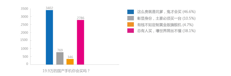 針對19.9萬元VEB V2的開賣,網易手機發起了“賣199999元的國產手機,你會買嗎”的調查,總共7303名網友參與投票,其中3402名網友稱“這么貴就是坑爹,鬼才會買”,占總人數46.6%;769名網友則表示“彰顯身份,土豪必須買一台”,占總人數10.5%;346名網友認為“有錢不如定制黃金版旗艦機”,占比4.7%;也有2786名網友稱“總有人買,壕的世界屌絲不懂”,占總人數38.1%。