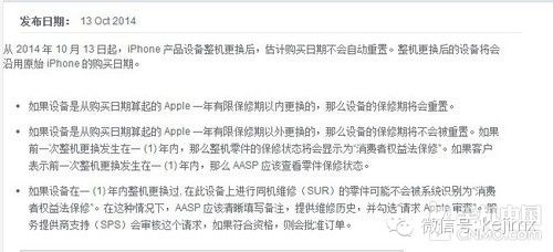 蘋果在本月13日於官網發布信息,文中提到將從2014年10月13日期,iPhone在進行整機更換之後,估計購買日期不會自動重置,整機更換後的設備將會沿用原始iPhone的購買日期。