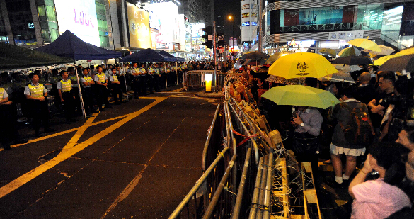 28日,香港违法的“占中”行动刚好满月。当天傍晚,“占中”行动在旺角占领区举行集会。中通社