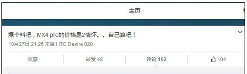 MX4 Pro的消息幾乎每天都有傳,其曝光率也隨著發布日的臨近居高不下,繼在微博中曝光了部分配置和全新設計的指紋解鎖Home鍵之後,價格似乎又有了新的消息,並不是之前傳聞的2999元。