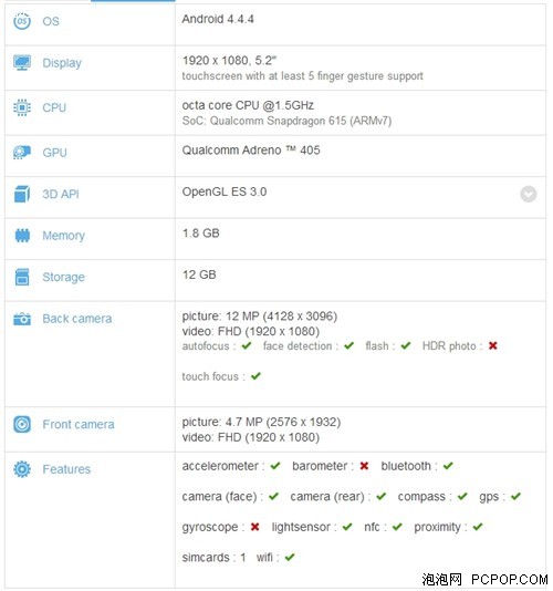 從圖片中可以看出,這款手機搭載了高通驍龍615處理器,它是高通的首款64位8核心處理器,主頻為1.5GHz。屏幕部分采用了5.2英寸1080P分辨率,前後攝像頭分別為1200W和500W像素,處在中等水平。