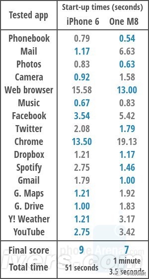 根據測試結果,iPhone 6共計耗時51秒;HTC One M8耗時1分零3.5秒,差距還是比較明顯的。