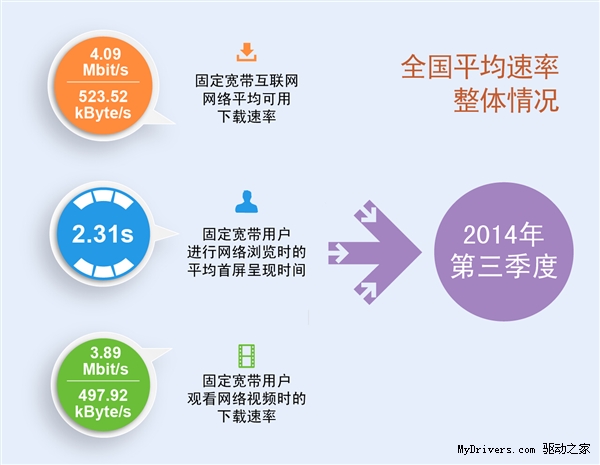 今日,寬帶發展聯盟發布了第5期《中國寬帶速率狀況報告》。報告顯示:2014年第3季度,中國固定寬帶互聯網網絡平均可用下載速率達到4.09 Mbit/s(523.5 kByte/s),用戶觀看網絡視頻時的下載速率為3.89Mbit/s(497.92kByte/s),用戶進行網頁瀏覽的平均首屏呈現時間為2.31s,全國基礎電信企業簽約用戶的平均固定寬帶接入速率符合度為110.6%。