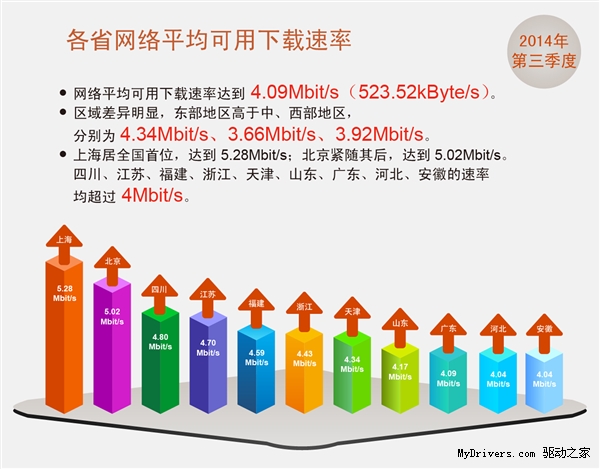 與二季度數據相比,全國平均可用下載速率雖然仍有增長,但增幅明顯收窄,2014年的前兩個季度可用下載速率分別增長了0.18Mbit/s和0.32Mbit/s,而本季度僅提升0.06Mbit/s。