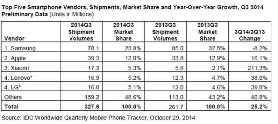 小米首次躋身全球五大智能手機廠商。憑借著對中國及其周邊市場的關注,該公司第三季度位居全球第三,實現了三位數的同比增長。該公司成功的主要原因是8月發布的小米4手機,這是一款定位高端的產品。該公司究竟能夠以多快的速度走出本土市場,並進一步推升銷量,將非常值得關注。