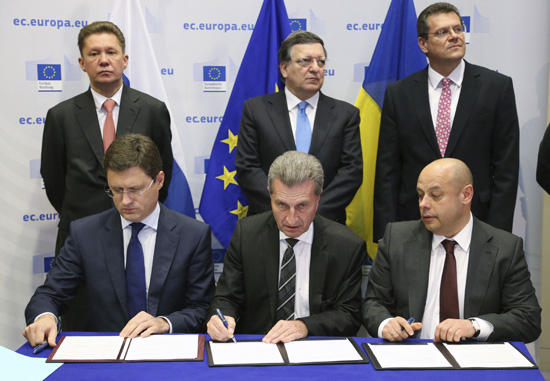 10月30日,在比利时首都布鲁塞尔欧盟总部,(前排从左至右)俄罗斯能源部长诺瓦克、欧盟委员会能源事务委员奥廷格与乌克兰能源和煤炭工业部长普罗丹一同签署输气协议。