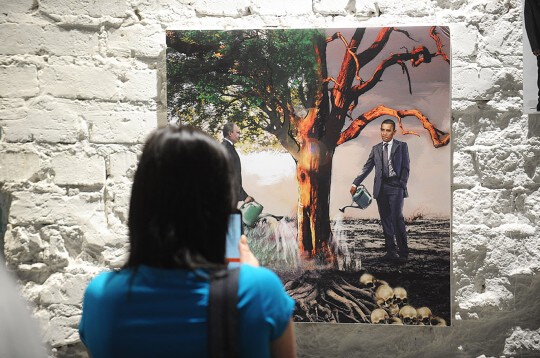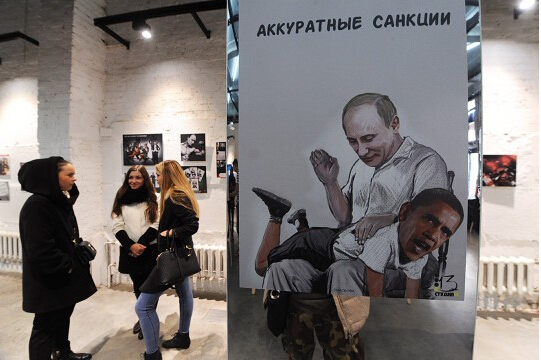 【環球網報道 記者 胥文琦】10月31日,一場名為“未加過濾”的愛國主義漫畫展在莫斯科舉行,吸引了不少民眾前往參觀。此次展覽展出了超過百名藝術創造者的作品,圍繞“俄羅斯”和“普京”為主題,凸顯了“俄式幽默與諷刺”。俄《報紙報》圖片頻道31日上傳了部分畫作圖片。一副“普京打奧巴馬屁股”的畫作以來圍觀,值得一提的是,這幅畫上面還意味深長地寫道“精準的懲罰”。