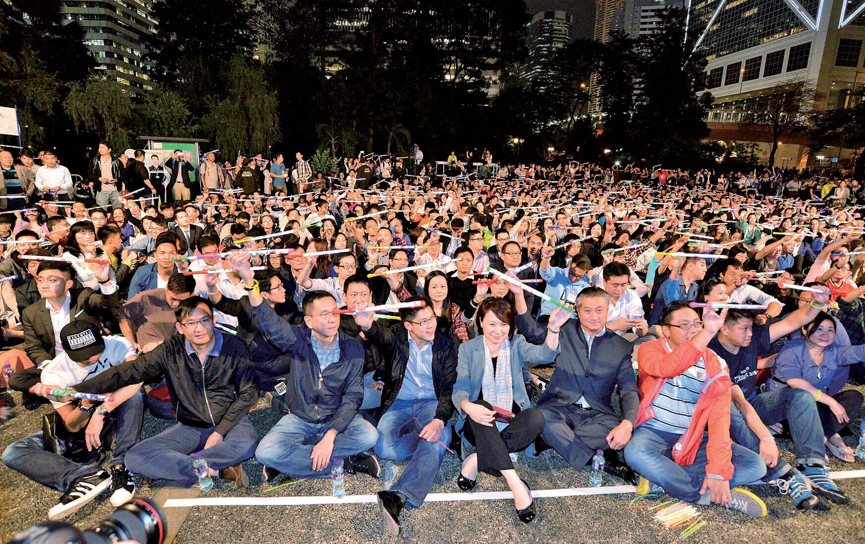 【香港商報訊】記者王卓軒報道:違法「佔中」行動持續一個多月,影響本港經濟、法治及民生,支持警方執法及要求還路於民的呼聲高漲。繼工聯會前晚在中區遮打花園舉行「還我道路還我生計」申訴大會後,香港各界青少年活動委員會等多個團體,昨晚再舉行「恢復秩序、着緊發展、共建未來」集會,有近千青年、上班族及市民出席,期望在關鍵時刻為社會注入正能量。與會人士在集會壓軸一刻橫向揮動閃光棒,寓意香港「路路通暢」。多位發言人亦在台上合唱《獅子山下》、《同舟之情》等耳熟能詳的歌曲,展現香港團結、努力的精神。