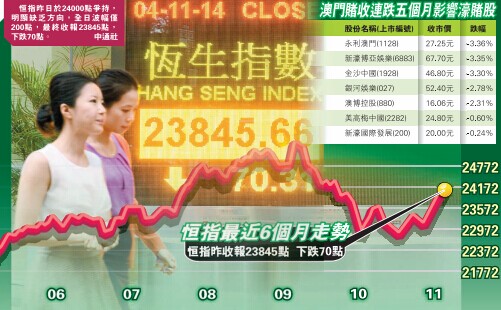 【香港商報訊】記者陳薇報道:特首梁振英昨日稱會爭取盡快令「滬港通」開通,刺激港股由跌轉升,重越24000點關口,惟午後公布澳門10月博彩收益按年急挫23%,濠賭股見光死,並帶領恒指再次向下,收報23845點,跌70點或0.29%,連續三個交易日與24000點關口擦身而過,成交略增至708億元。國指跑贏恒指,收報10727點,升67點或0.63%。分析料,大市短期呈上落格局。