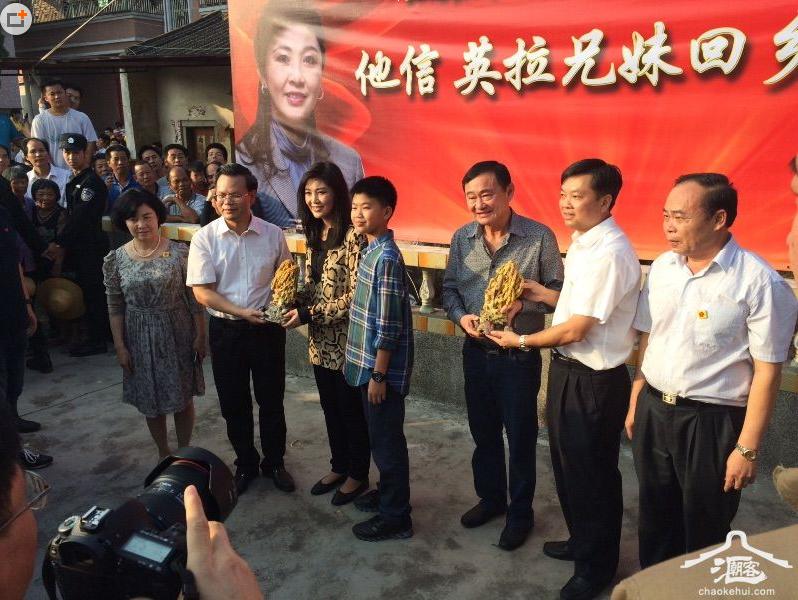 據泰國星暹傳媒10月31日報導,泰國前總理英拉、他信今天下午來到祖籍所在地廣東梅州豐順縣尋根,受到當地政府和民眾熱烈歡迎。 英拉、他信在政府大樓前合影留念,當地民眾還送上稻穗玉雕表示祝福。道路兩旁寫著“熱烈歡迎旅泰僑胞他信、英拉兄妹回鄉探親”的橫幅更顯親切。