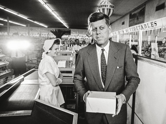 約翰·F·肯尼迪,美國第35任總統。美國著名的肯尼迪家族成員,他的執政時間從1961年1月20日開始到1963年11月22日在達拉斯遇刺身亡為止。肯尼迪於1960年當選為美國總統,成為美國曆史上最年輕的當選總統,也是美國曆史上首位信奉羅馬天主教的總統和唯一獲得普利策獎的總統。肯尼迪在職期間備受爭議,讓我們來回顧一下這樣一位傳奇美國總統的“白宮之路”。圖為約翰·F·肯尼迪1960年4月,在他當選總統的前幾個月,訪問一個西弗吉尼亞州的雜貨店(鳳凰獨家編譯,轉載請標明出處)