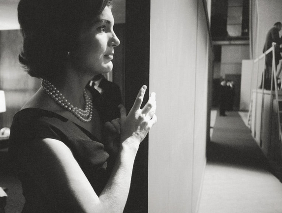 在紐約一個電視演播室中,傑奎琳·肯尼迪遠遠看著她在總統辯論的丈夫