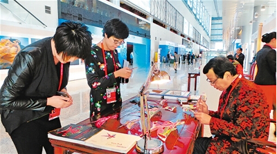 兩位參會代表觀賞國家會議中心大廳展示的哈氏風箏工藝。本報記者 暨佩娟攝