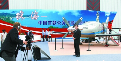 全球媒體紛紛聚焦珠海,中國航展成國際關注焦點。圖為第九屆航展,國外媒體報道中國首款公務機——領航150