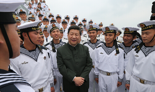習近平近日在“海口”艦上視察時,與水兵親切交談。新華社