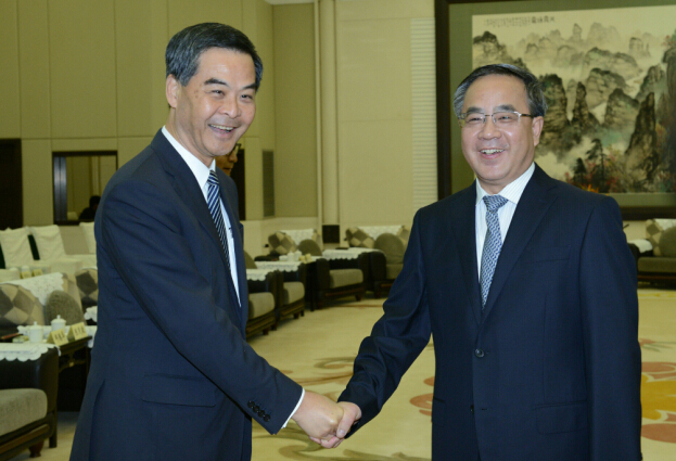 梁振英(左)在会议前与广东省委书记胡春华会面时握手。中通社