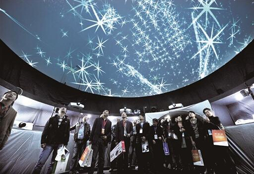 直徑7米的半球形熒幕位于帳篷頂部,站在下方仰頭觀看星云、海浪、雨滴、飛行的物體等一一閃現,這些物體就像從頭頂傾瀉而下,令人目眩神迷。
