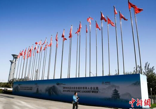 11月5日,2014年亞太經合組織(簡稱APEC)最后一次高官會在北京的國家會議中心舉行。圖為藍天下的會議周背板。 中新社發 張浩 攝